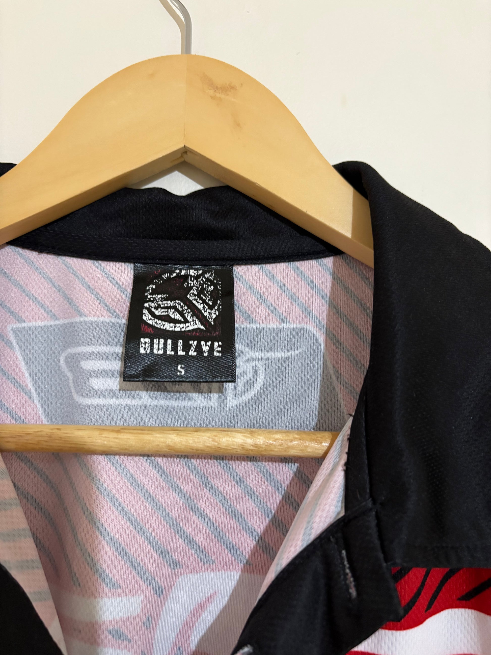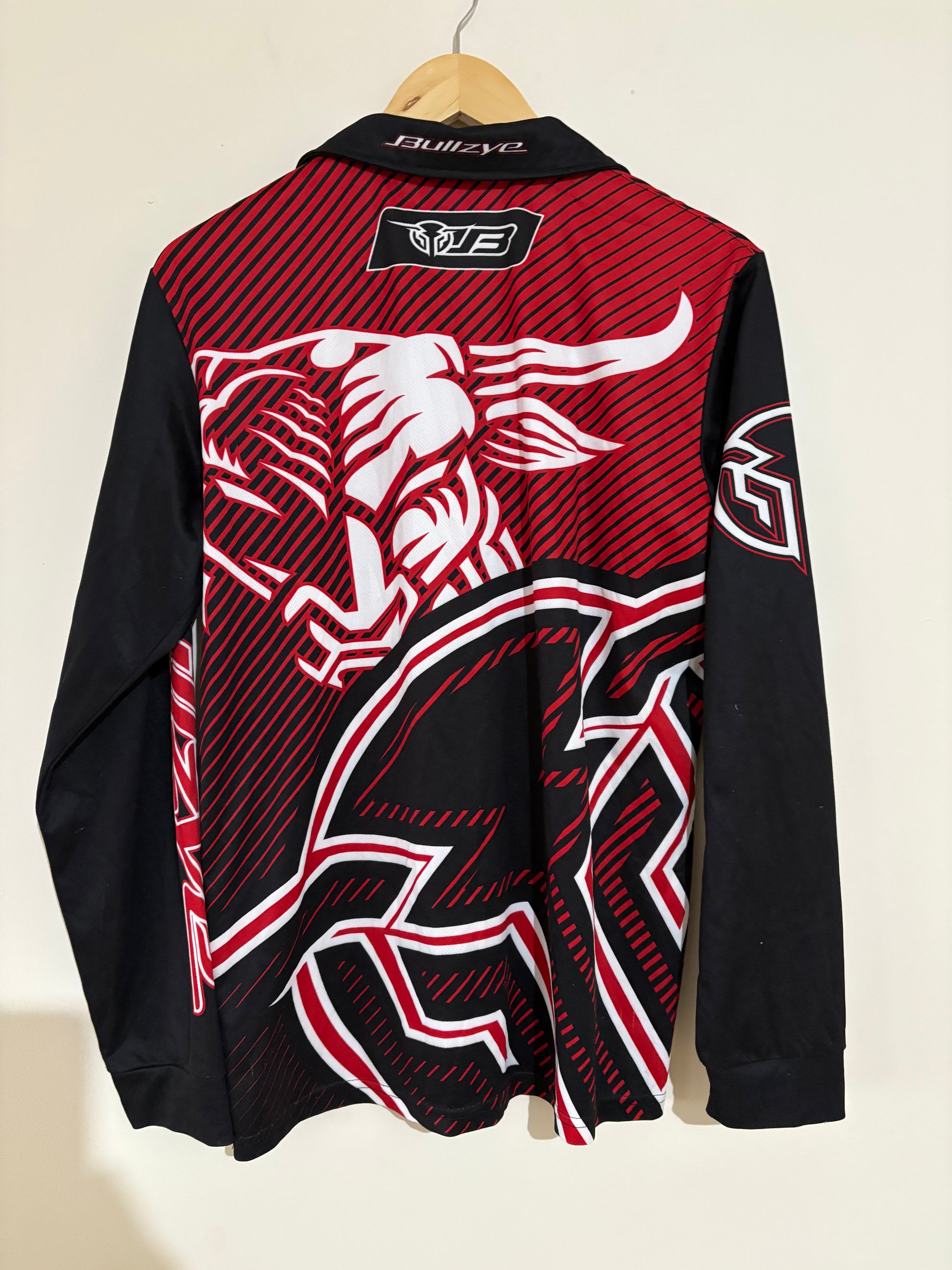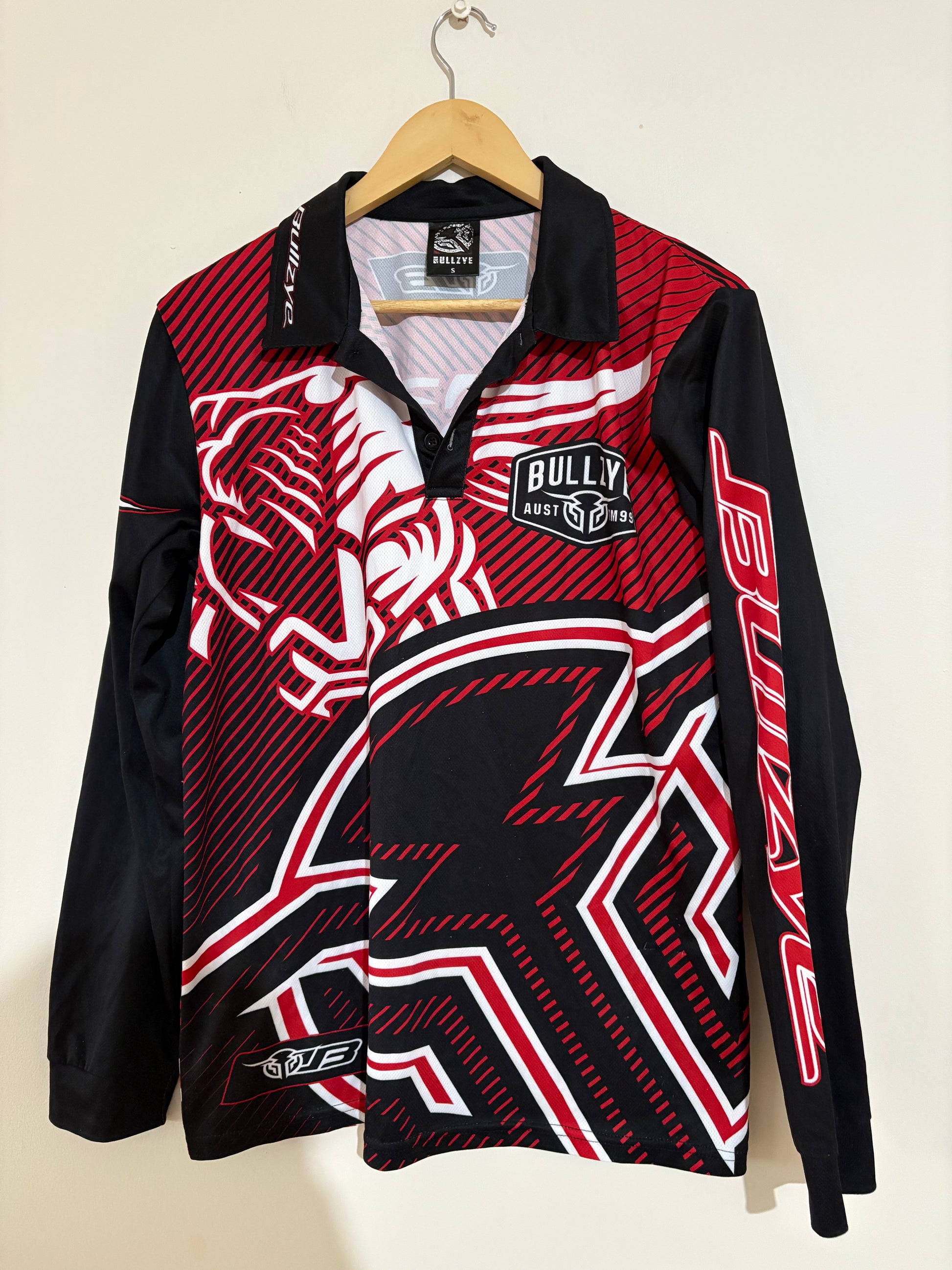 Bullzye red and black fishing shirt. UPF 50+, 100% polyester, elastic cuffs. In really good condition.