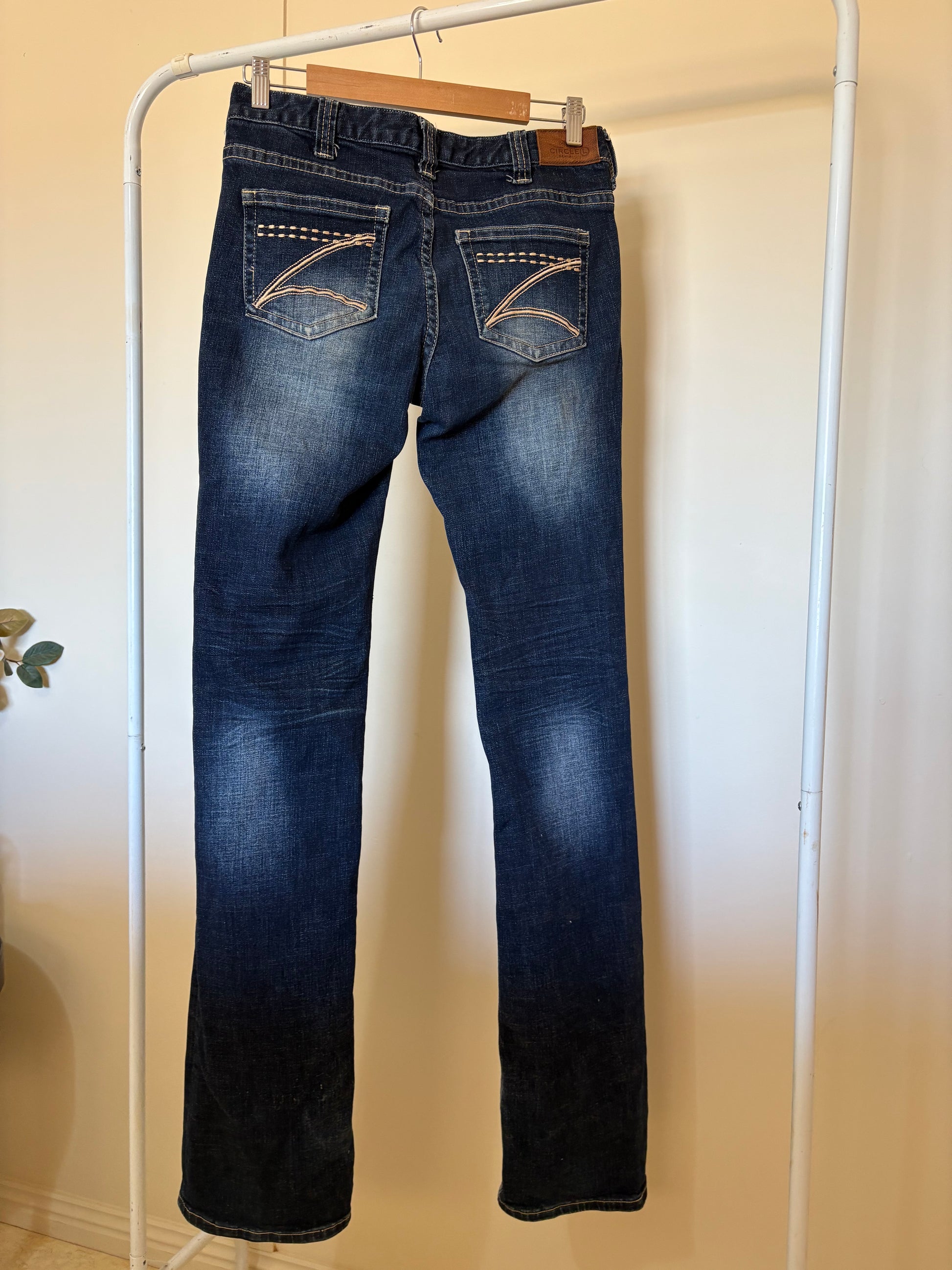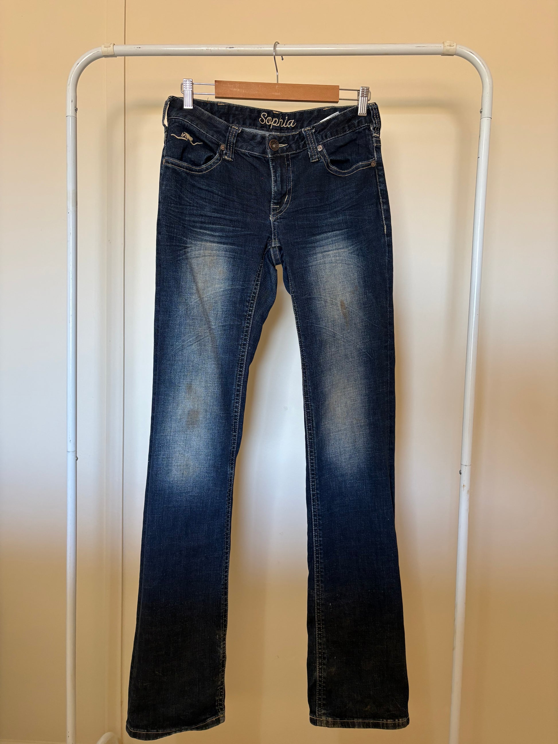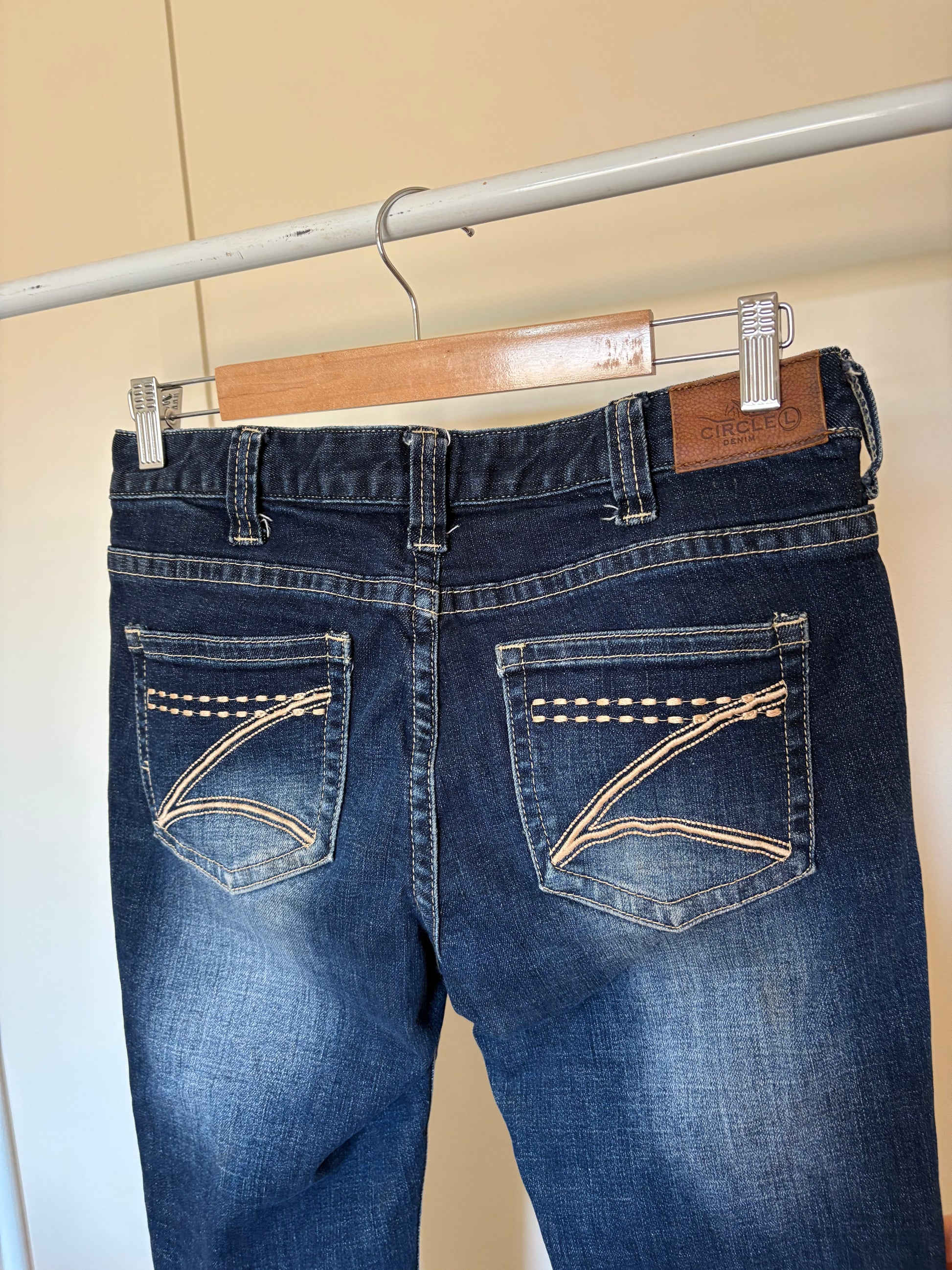 Circle L ‘Sophia’ jeans, mid rise, boot cut. Dark denim with gold stitching. Some staining as seen in photos, otherwise in really good condition