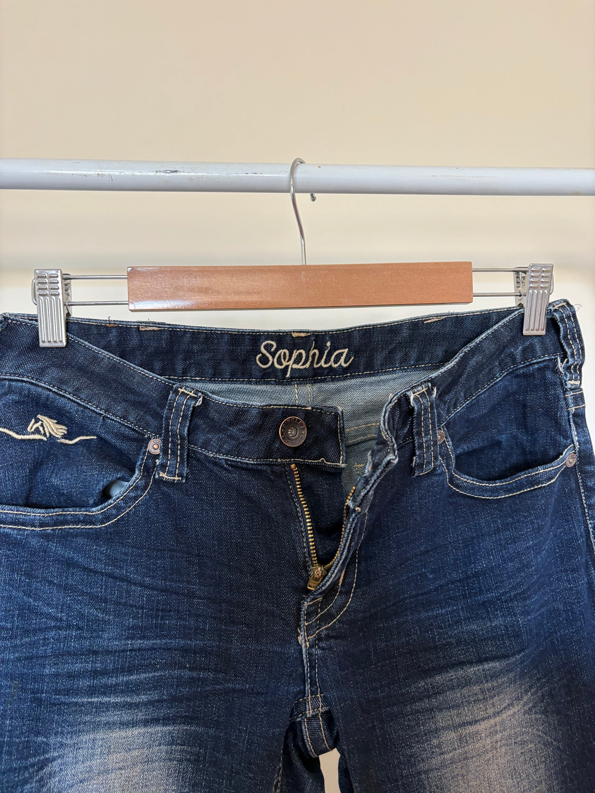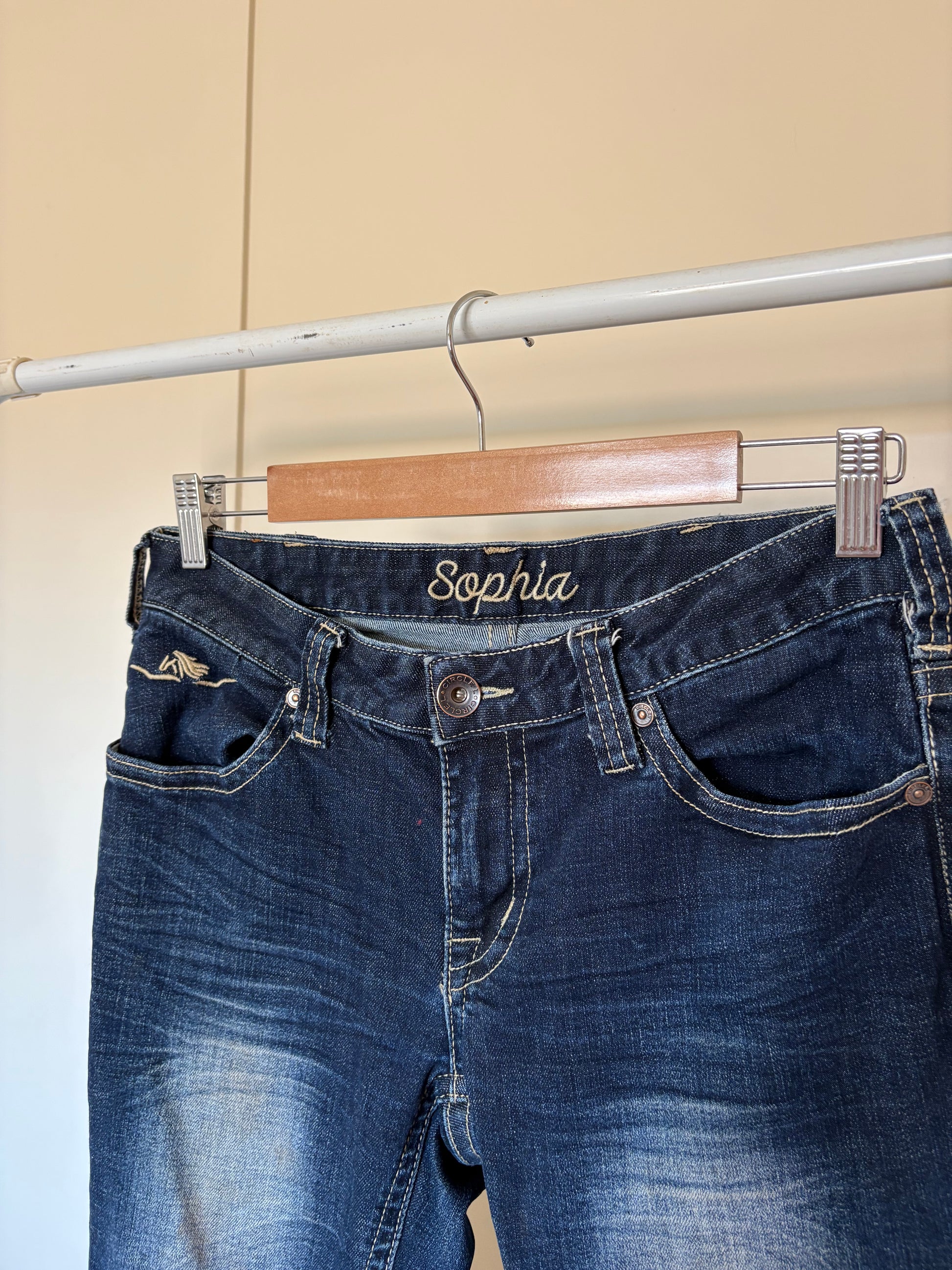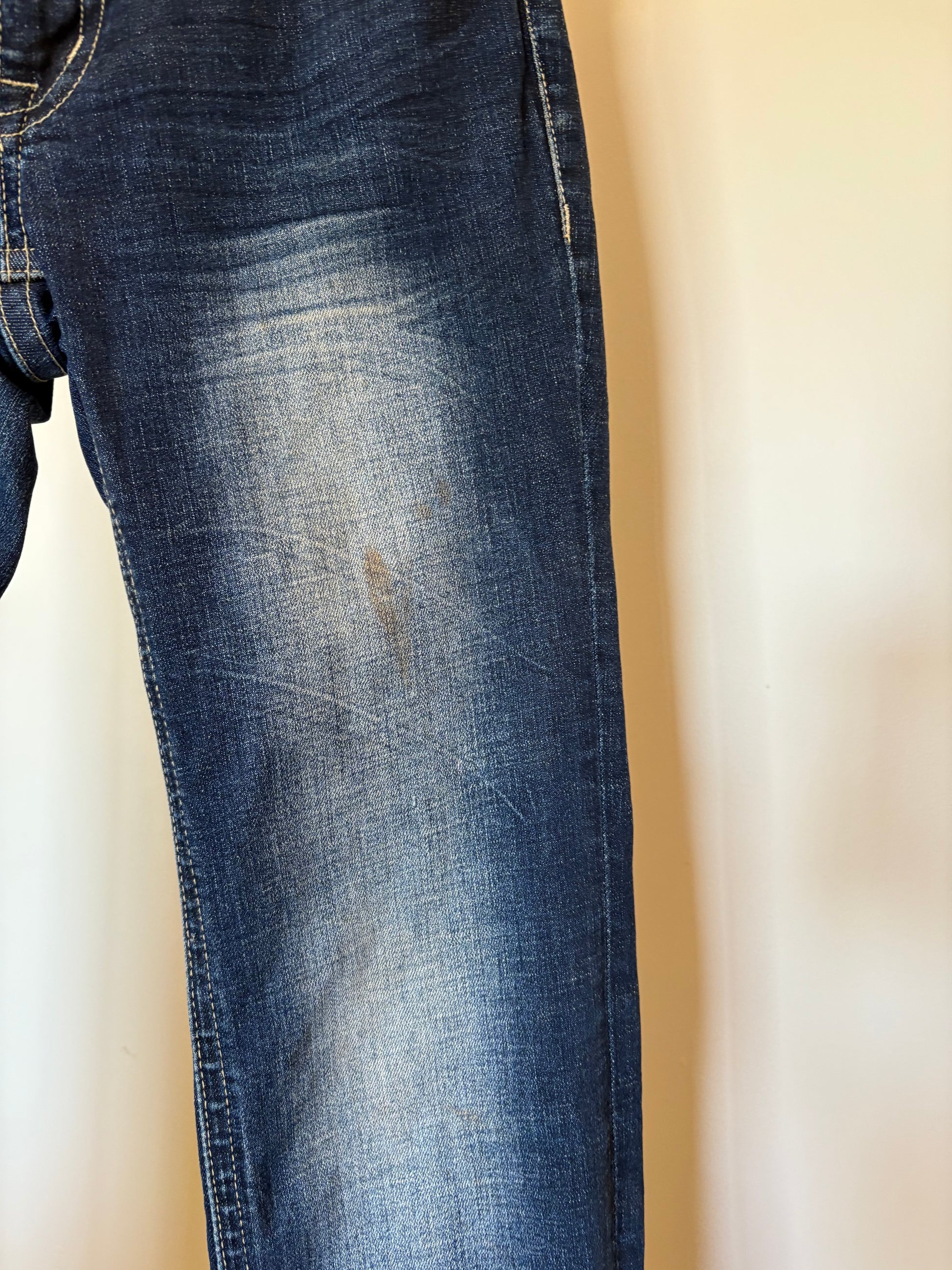 Circle L ‘Sophia’ jeans, mid rise, boot cut. Dark denim with gold stitching. Some staining as seen in photos, otherwise in really good condition
